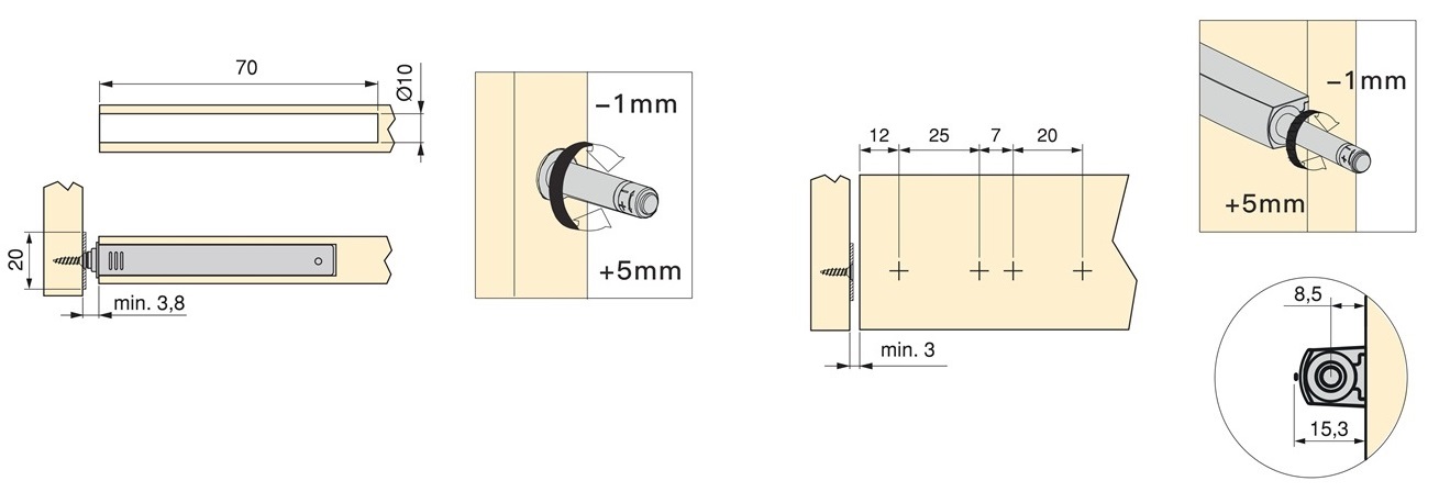 - Odległość między 1900321 mechanizmu otwierania drzwi typu push-to-open a krawędzią drzwi wynosi 12 mm (15/32″)