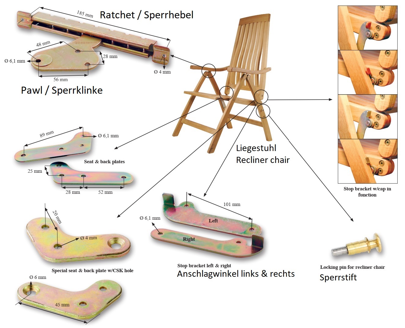 Wysokiej jakości zapadki 04.05.015-2 (04.05.015) zapewniają, że oparcie leżaka ogrodowego lub leżaka lub oparcie krzesła leżaka zablokuje się bezpiecznie w wygodnej pozycji.