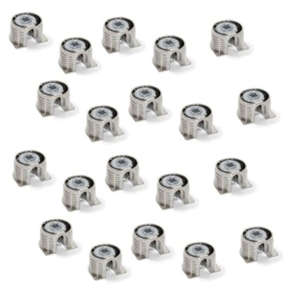 20 sztuk stabilnego połączenia mimośrodowego ⌀20 mm z kołnierzem i zewnętrznym płaszczem pazurowym do grubości blachy 16 mm (5/8″), wykonane z znalu, 8470907. Solidny łącznik mimośrodowy do łączenia mebli i wielu innych, firmy EMUCA