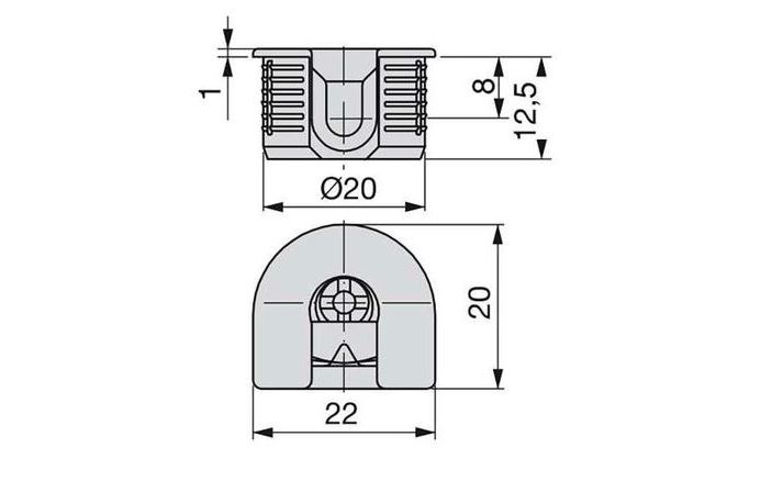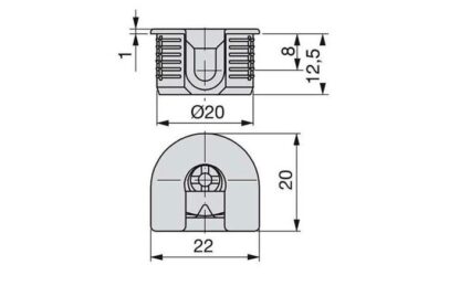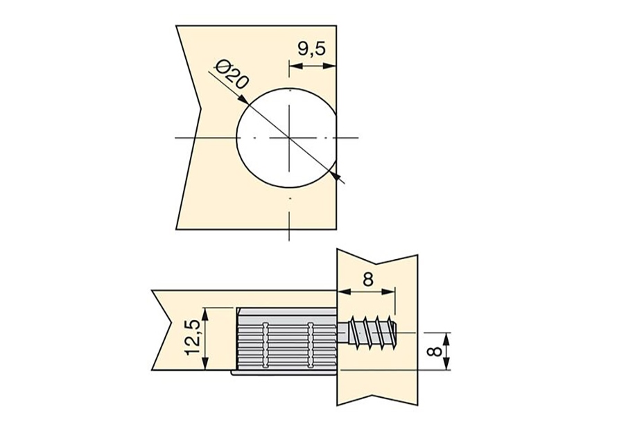 Typowe zastosowanie: Wkładanie do półek lub przegród z otworem ⌀20 mm (25/32″) o głębokości 12,5 mm (31/64″) w połączeniu z pasującymi kołkami mimośrodowymi.