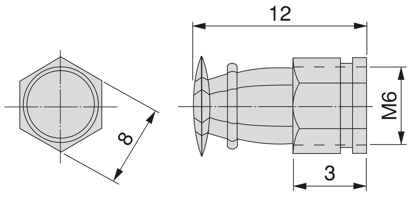Po wkręceniu M6 gniazdo rozchodzi się w przygotowanym otworze i bezpiecznie zakotwicza się w materiale.