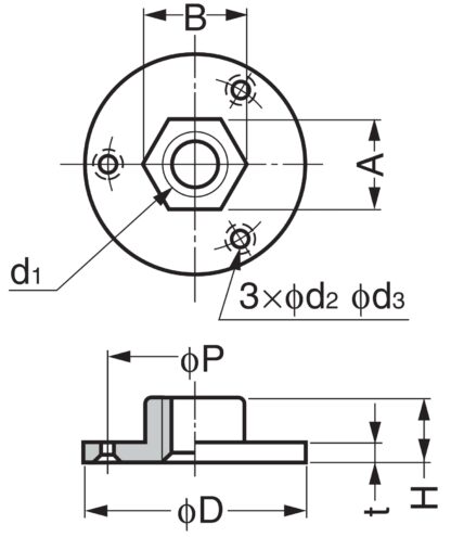 - Górna płyta posiada trzy otwory montażowe o średnicy (⌀d2) ⌀3,2 mm (1/8″) i jest przymocowana do dolnej powierzchni mebla za pomocą trzech (brak w zestawie)