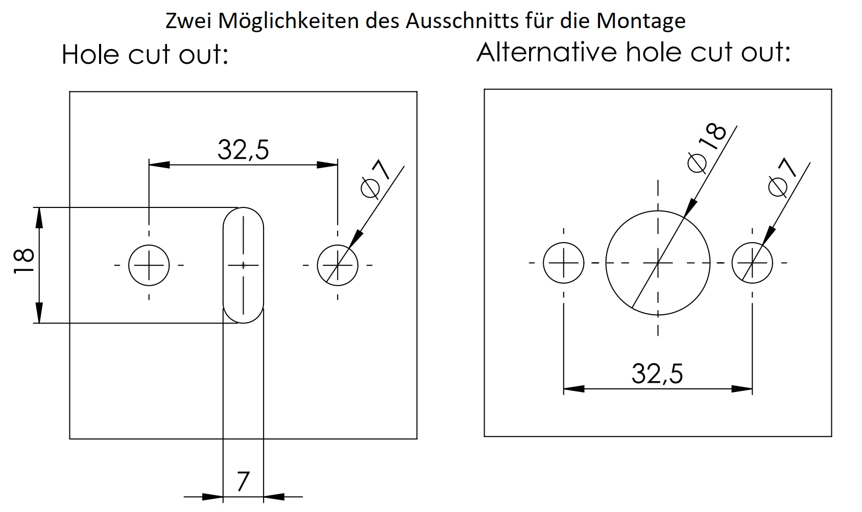- Do montażu z przodu należy wykonać wycięcie o wysokości 18 mm (45/64″) i szerokości 7 mm