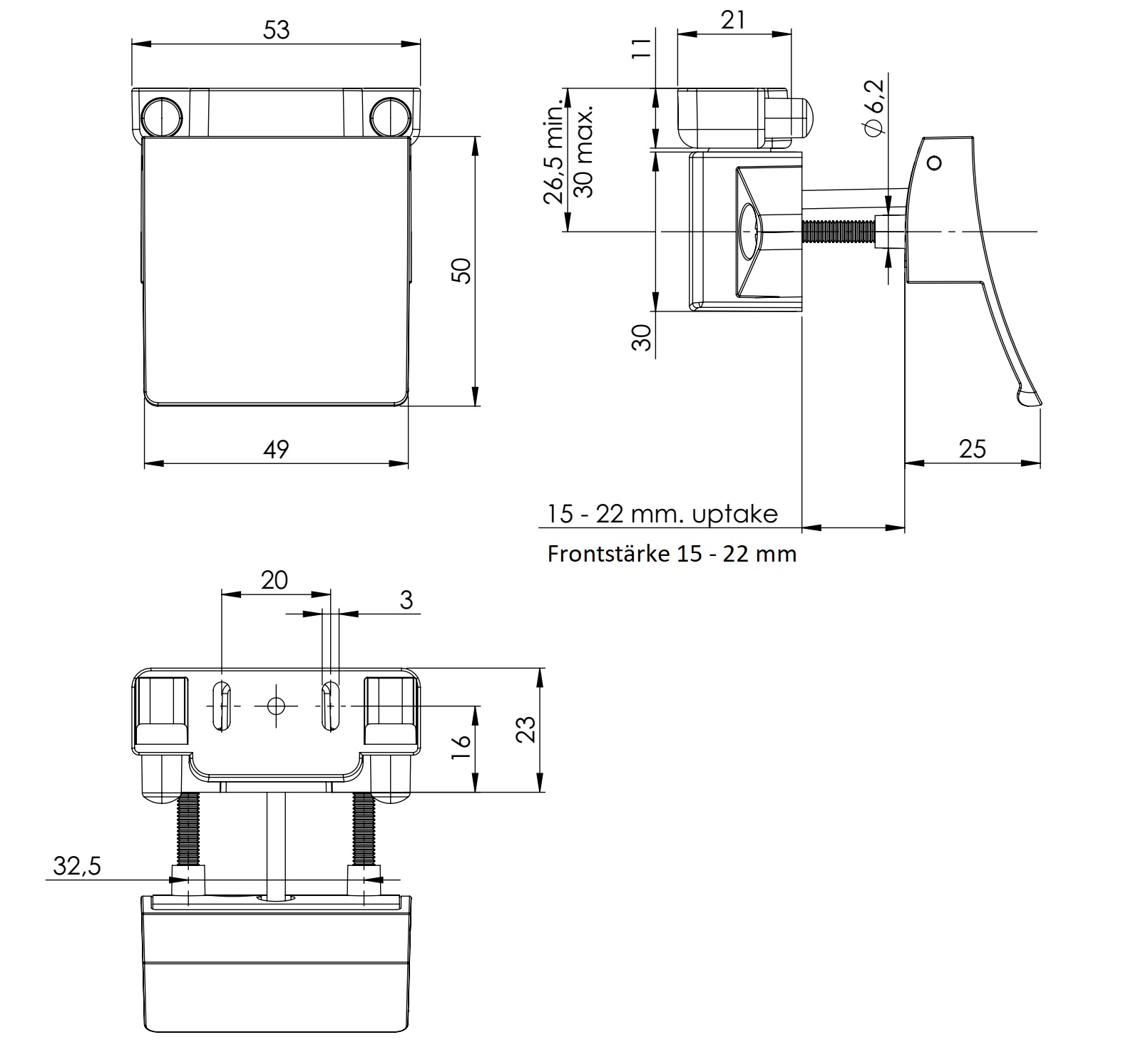 Uchwyt do podnoszenia 14.03.076-0 nadaje się do drzwi o grubości od 15 mm (19/32″) do 22 mm (55/64″).