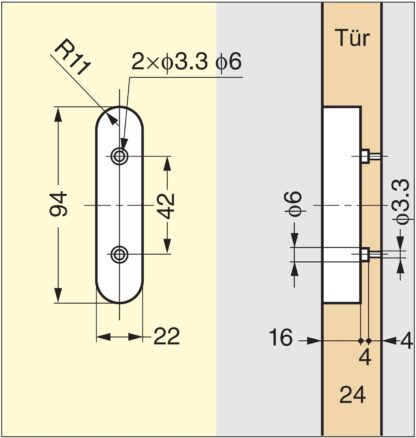 - Do montażu w drzwiach blaszanych wymagana jest podkładka dystansowa (patrz przykładowy rysunek poniżej). Nie jest to uwzględnione w zakresie dostawy (szczegóły można znaleźć w rysunku montażowym)