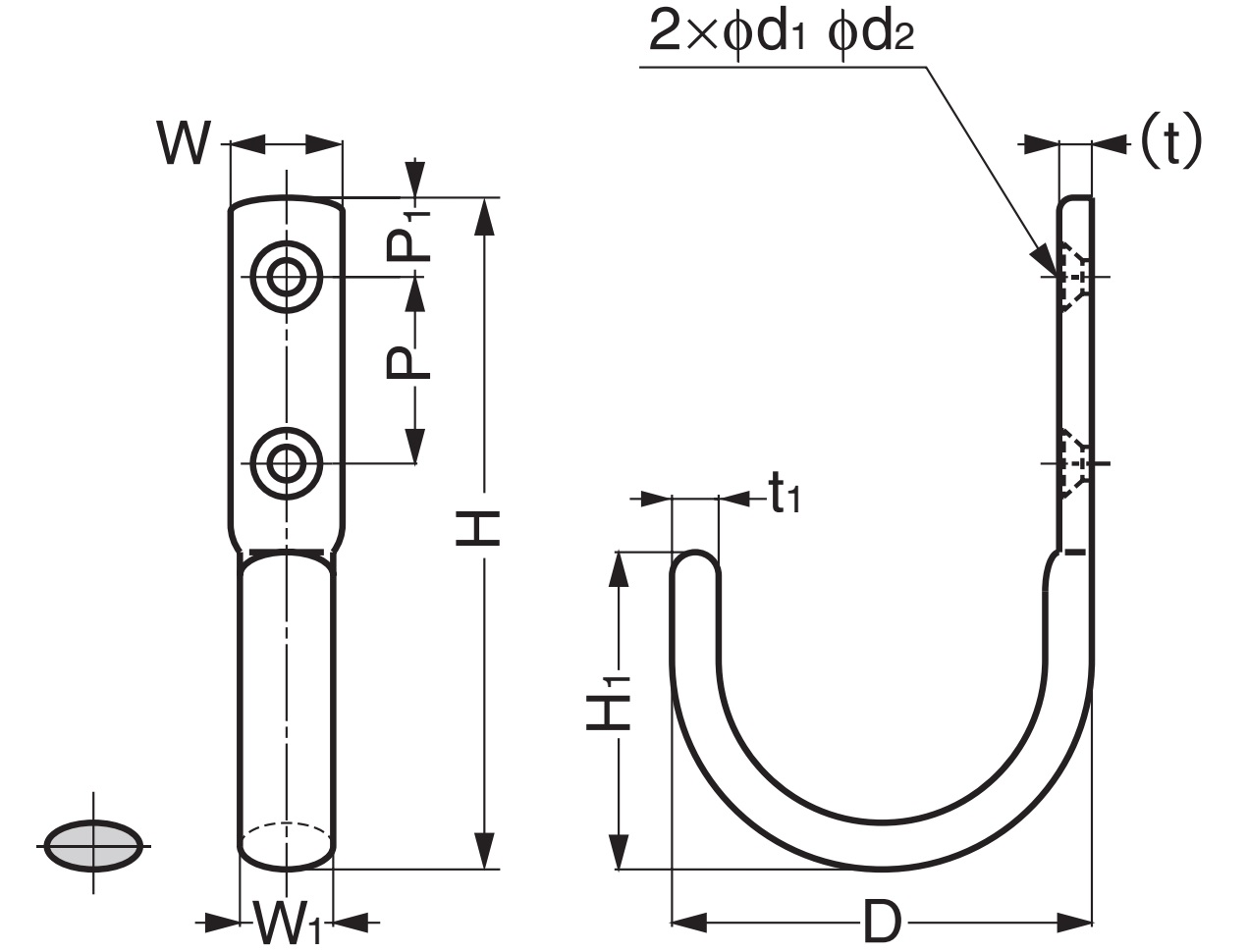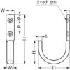 - Hak uniwersalny JF45M posiada dwa otwory montażowe o średnicy (⌀d1) ⌀3,8 mm (5/32″) z pogłębiaczem stożkowym