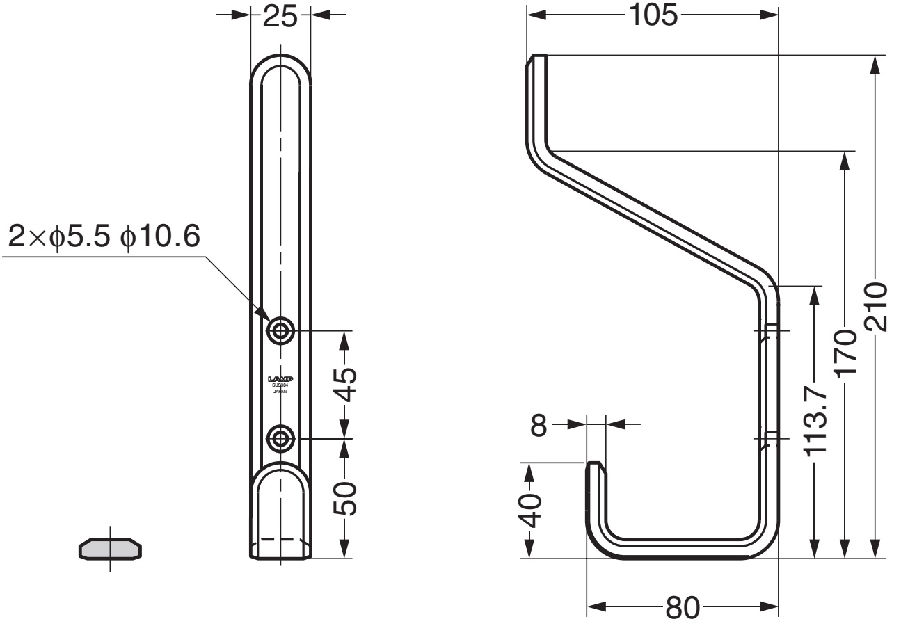 - Uniwersalny podwójny hak XL-SB-210-S posiada dwa otwory montażowe o średnicy (⌀d1) ⌀5,5 mm (7/32″) z pogłębiaczem stożkowym
