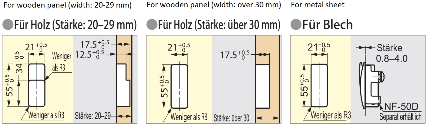 - Do montażu w płycie drewnianej lub blasze należy wykonać wycięcie o wymiarach 55 mm (2-11/64″) x 21 mm (53/64″)