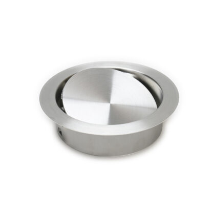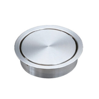 Wysokiej jakości kosz na śmieci z cichym domykiem, wykonany ze stali nierdzewnej, powierzchnia: satynowy mat, konstrukcja: okrągła ⌀136 mm (5-23/64″), AD-GD011-HL. Samozamykające się drzwi na śmieci ze stali nierdzewnej, do mebli kuchennych, gabinetu lekarskiego i wielu innych, firmy Sugatsune / LAMP® (Japonia)