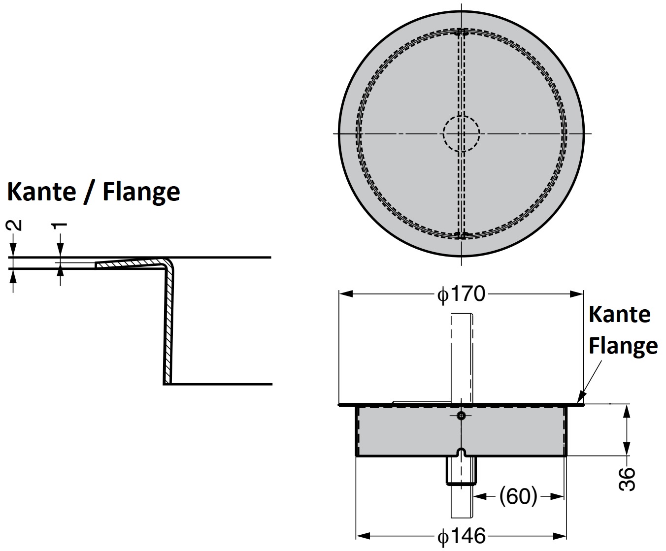 Wysokiej jakości okrągły właz na śmieci, wahadłowy, do montażu poziomego, AD-DH015-HL, 170 mm, firmy Sugatsune, wykończenie satynowe. Rysunek montażowy