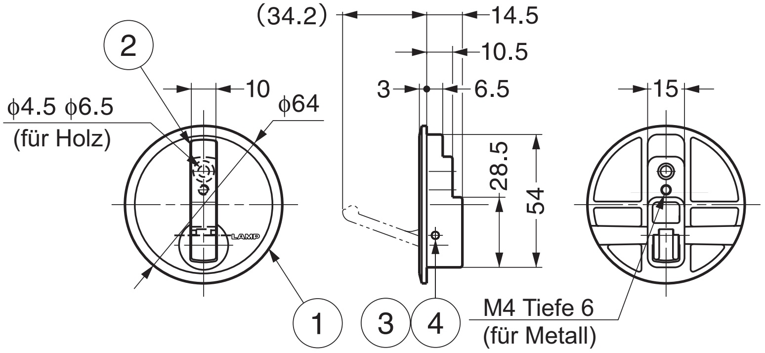 - Hak sprężynowy NF-R64-BL posiada otwór montażowy o średnicy ⌀4,5 mm, z pogłębiaczem stożkowym do montażu w płycie drewnianej