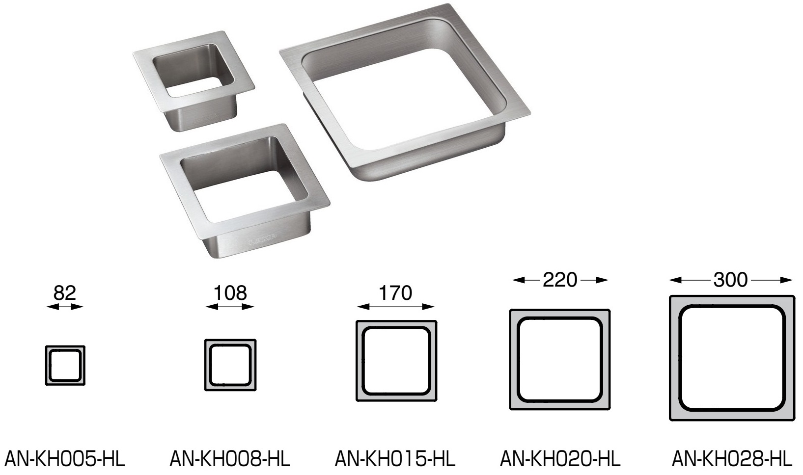Wysokiej jakości prostokątny wysypisko śmieci, wykonane ze stali nierdzewnej V2A (SUS304 lub 1.4301), powierzchnia: satynowy mat, AN-KH005-HL, rozmiar: 56 mm (2-13/64″)