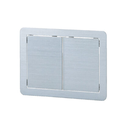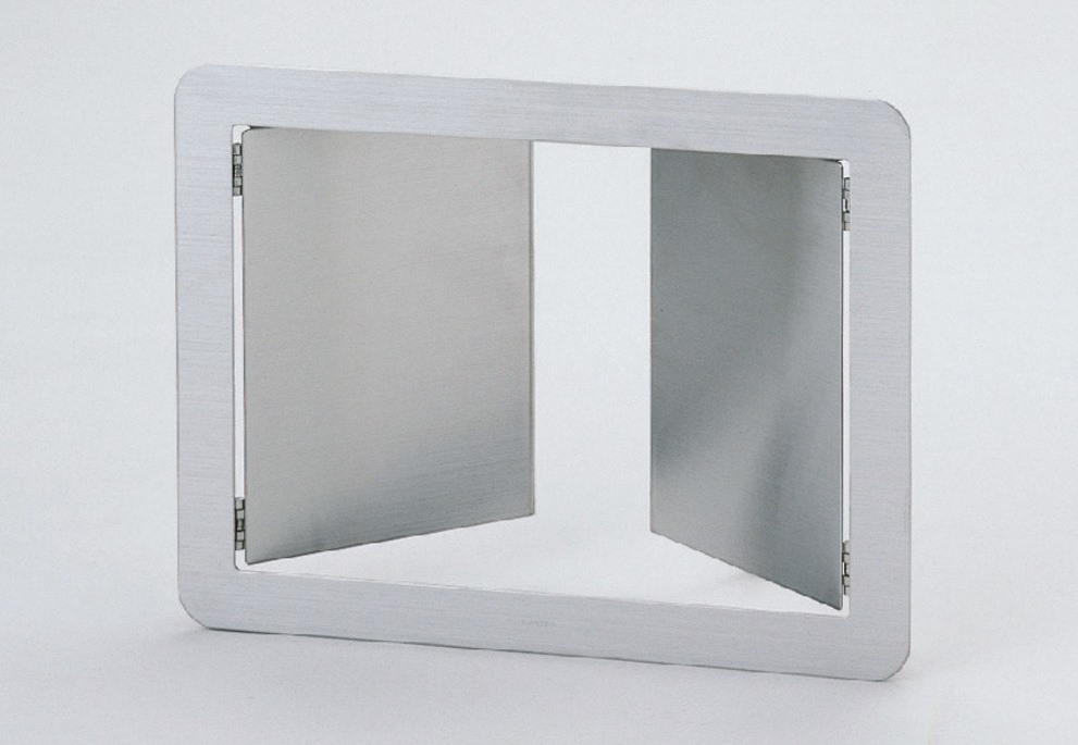 Wysokiej jakości prostokątna klapa samozamykająca się do montażu pionowego, z dwojgiem zsynchronizowanych drzwiczek, wykonana ze stali nierdzewnej SUS304 (V2A lub 1.4301), powierzchnia: satynowy mat, AZ-DD310-HL, rozmiar: 370 mm (14-9/16″)