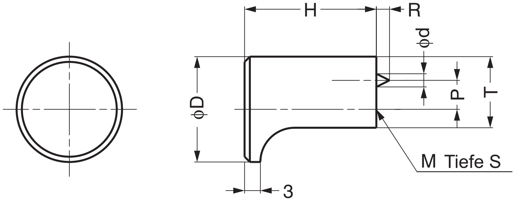 - Rękojeść posiada również igłę o długości (R) 2,5 mm (3/32″) i średnicy (⌀d) ⌀2 mm (5/64″). Ten kołek mocujący zapewnia, że uchwyt pokrętła jest bezpiecznie i stabilnie zamontowany i nie obraca się podczas użytkowania
