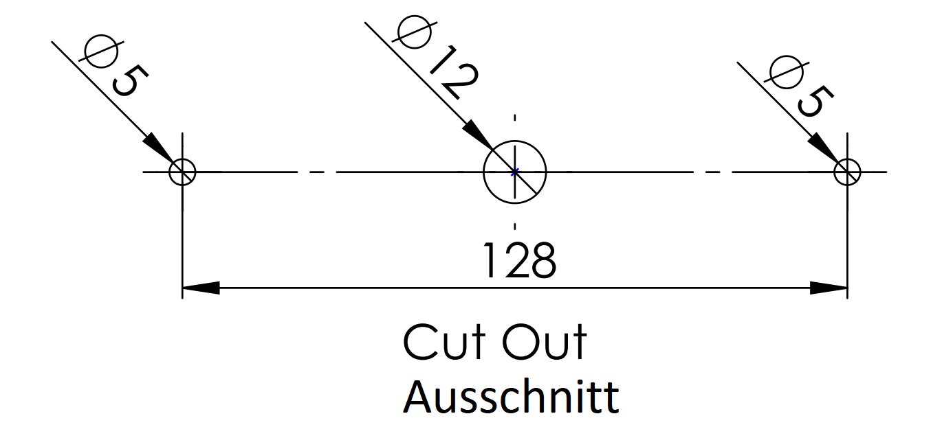 - Do montażu należy wywiercić z przodu dwa otwory o średnicy ⌀5 mm (13/64″) i jeden otwór o średnicy ⌀12 mm (15/32″)