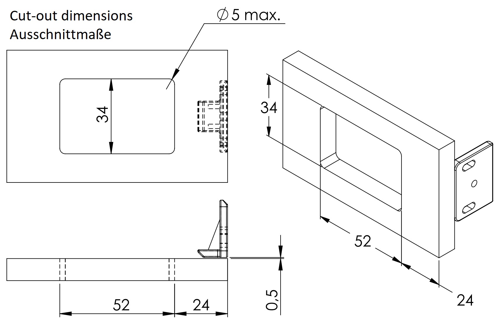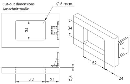 - Do montażu z przodu należy wykonać wycięcie o szerokości 52 mm (2-3/64″) i wysokości 34 mm (1-11/32″)