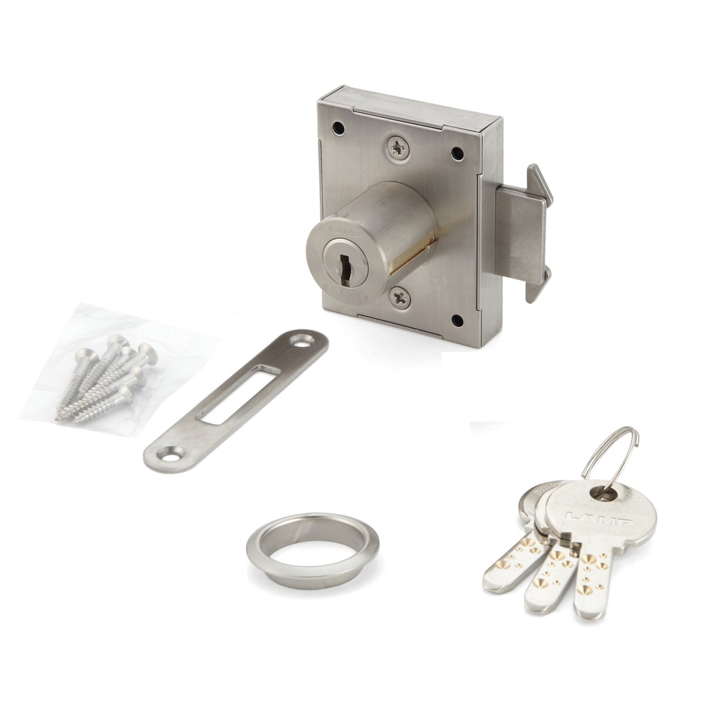 Wysokiej jakości zamek do drzwi przesuwnych z hakiem 7810K-24-SNI-R-D, z rozetą bębenkową i trzema kluczami, z zaczepem, z solidną stalą szlachetną (SUS304 lub V2A), powierzchnia: niklowana, matowa satynowana, wersja: z kluczem