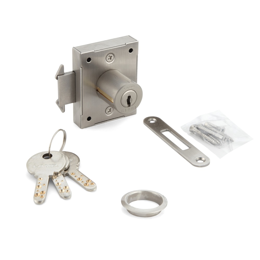 Wysokiej jakości zamek do drzwi przesuwnych z hakiem 7810K-24-SNI-L-D, z rozetą bębenkową i trzema kluczami, z zaczepem, z solidnej stali nierdzewnej (SUS304 lub V2A), powierzchnia: niklowana, matowa satynowana, wersja: z takim samym kluczem