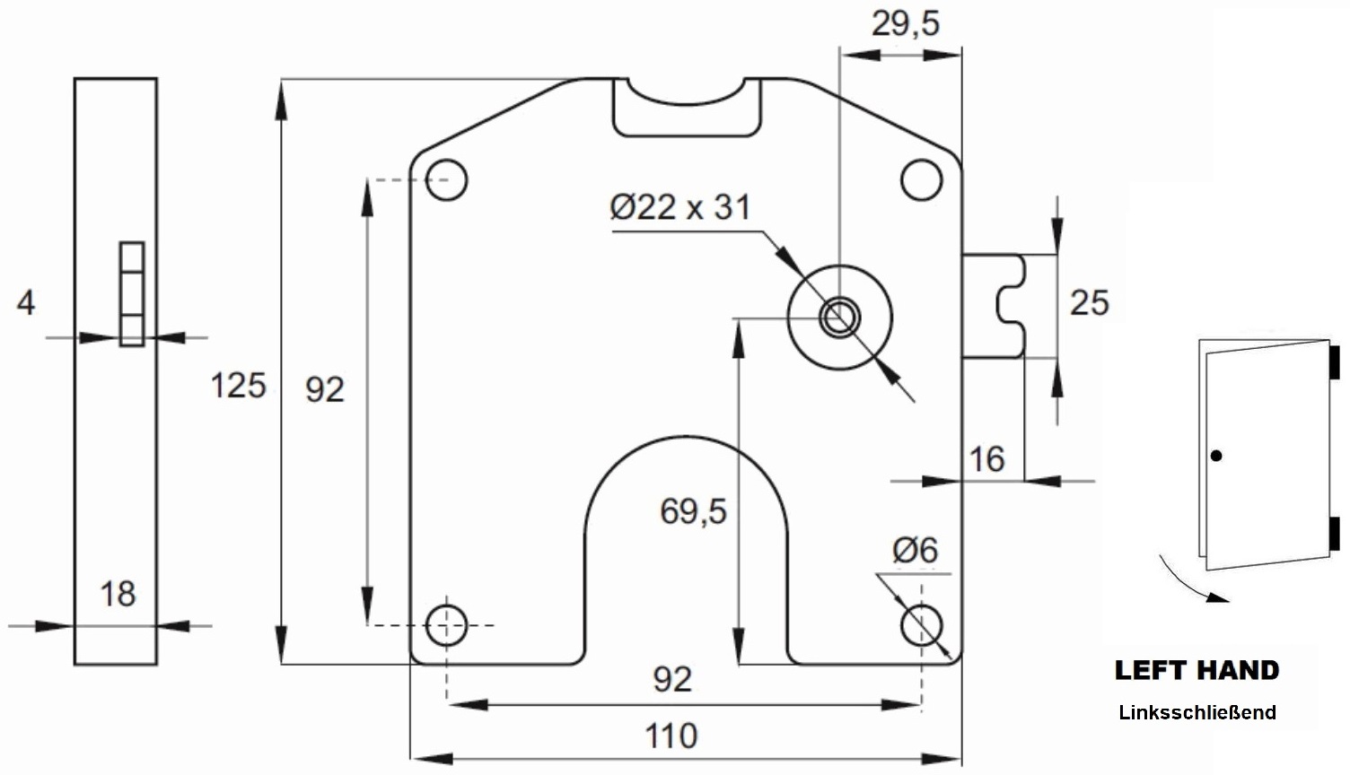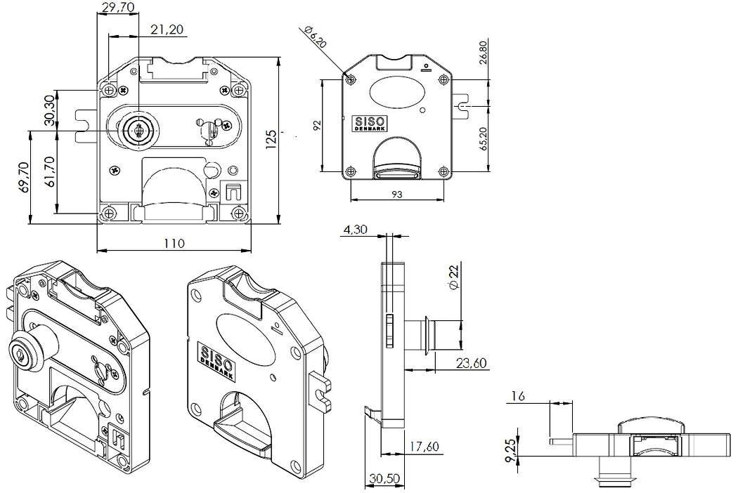 - Zamki pastylkowe 14.60.249-C posiadają cztery otwory montażowe o średnicy ⌀6,2 mm (1/4″)