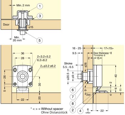 - Korpus rygla wkręca się we wstępnie narysowane otwory szczelinowe za pomocą czterech wkrętów do płyt wiórowych 3 x 14 mm, przy czym w zależności od grubości drzwi wkłada się pierścień dystansowy
