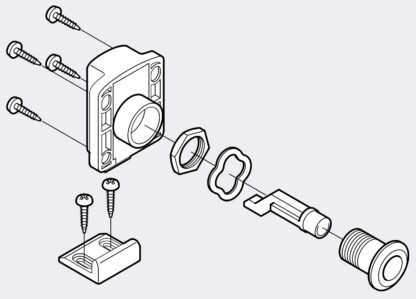 - Korpus rygla wkręca się we wstępnie narysowane otwory szczelinowe za pomocą czterech wkrętów do płyt wiórowych 3 x 14 mm, przy czym w zależności od grubości drzwi wkłada się pierścień dystansowy